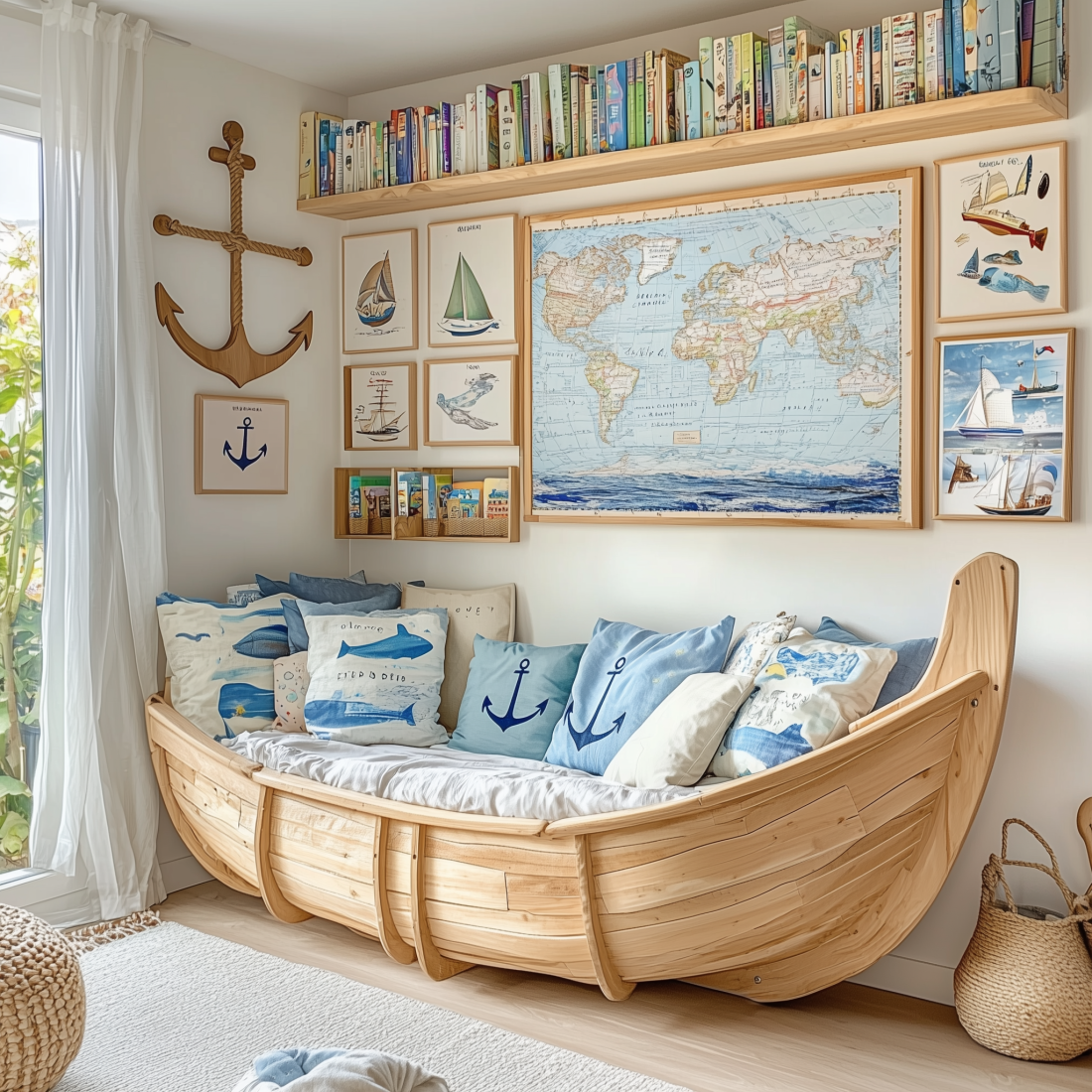 Bookshelves: Wall-mounted boatshelves are both functional and thematic.