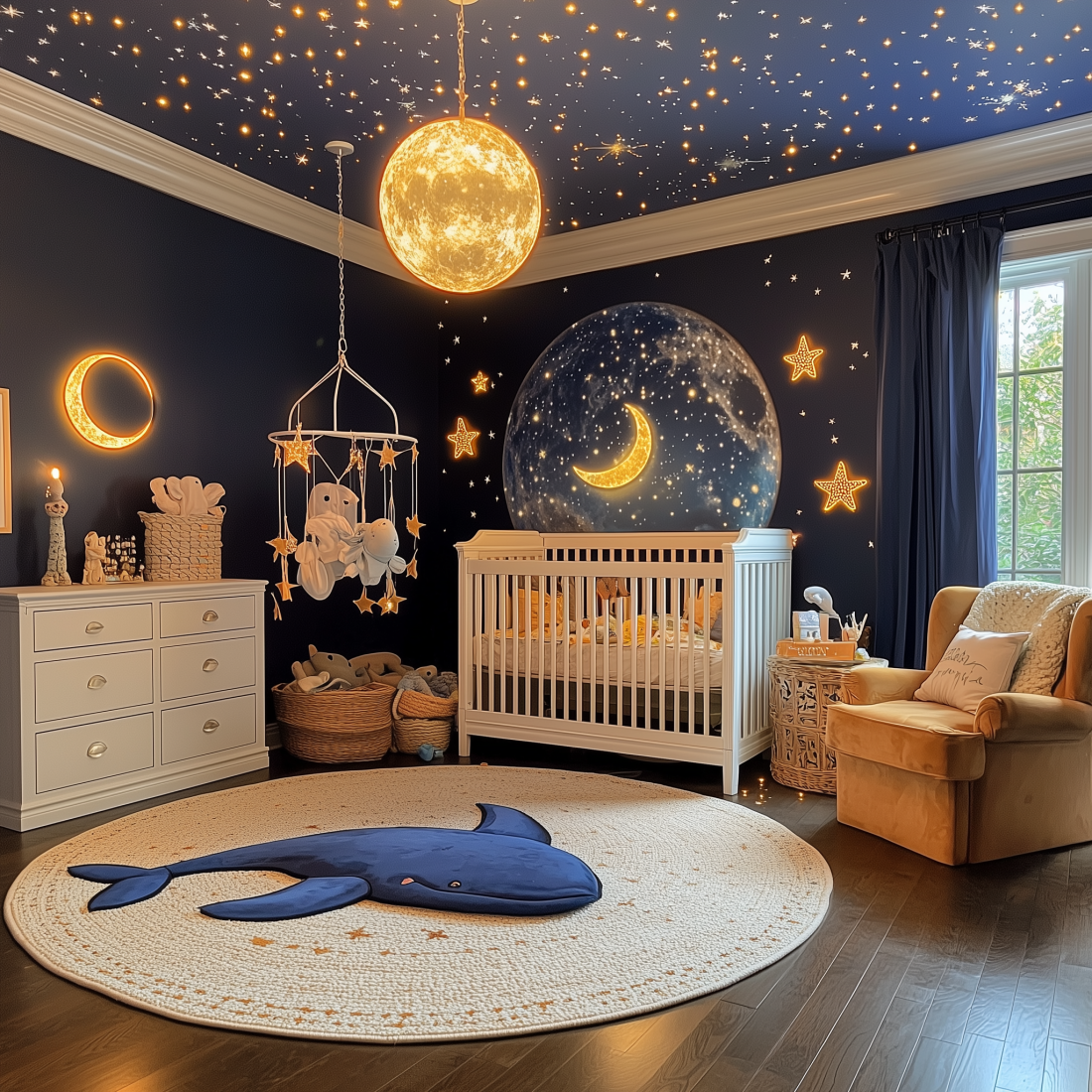 Navy walls with constellations, glowing star stickers, and sea-themed bedtime books.
