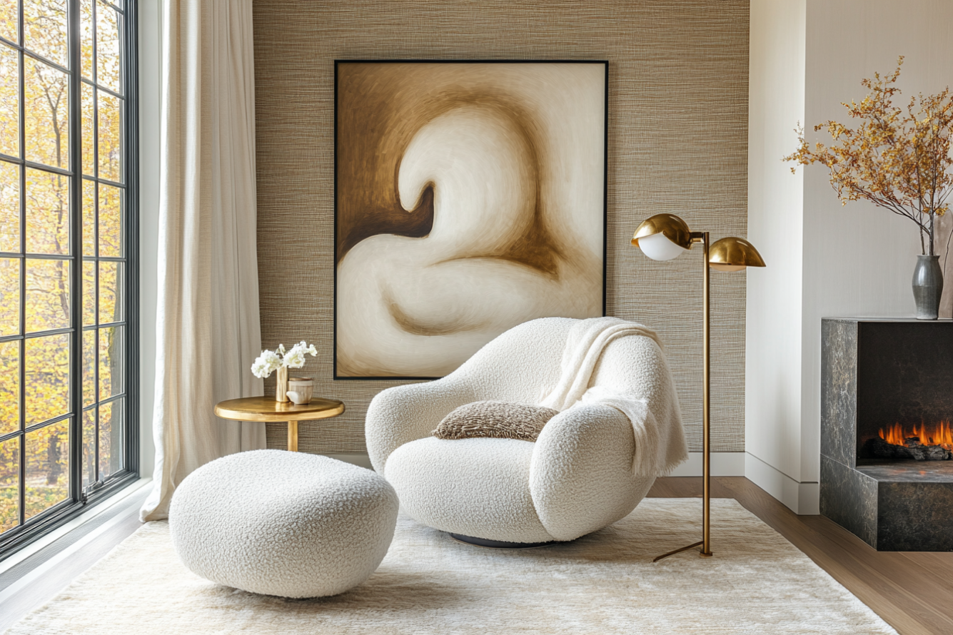 Bouclé & textured knits — upholstery swatches of boucle make chairs look bespoke. Bouclé is trending as a tactile staple.