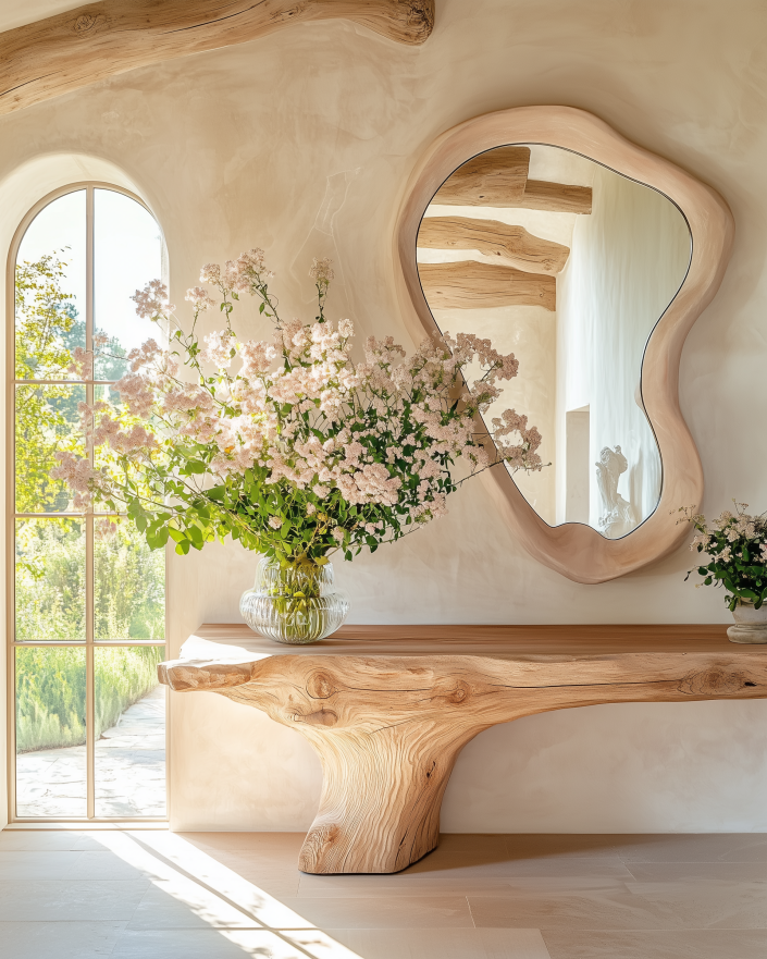 Why it works: Combines organic edges with rustic warmth. Great for entryways, farmhouse, or modern boho spaces.