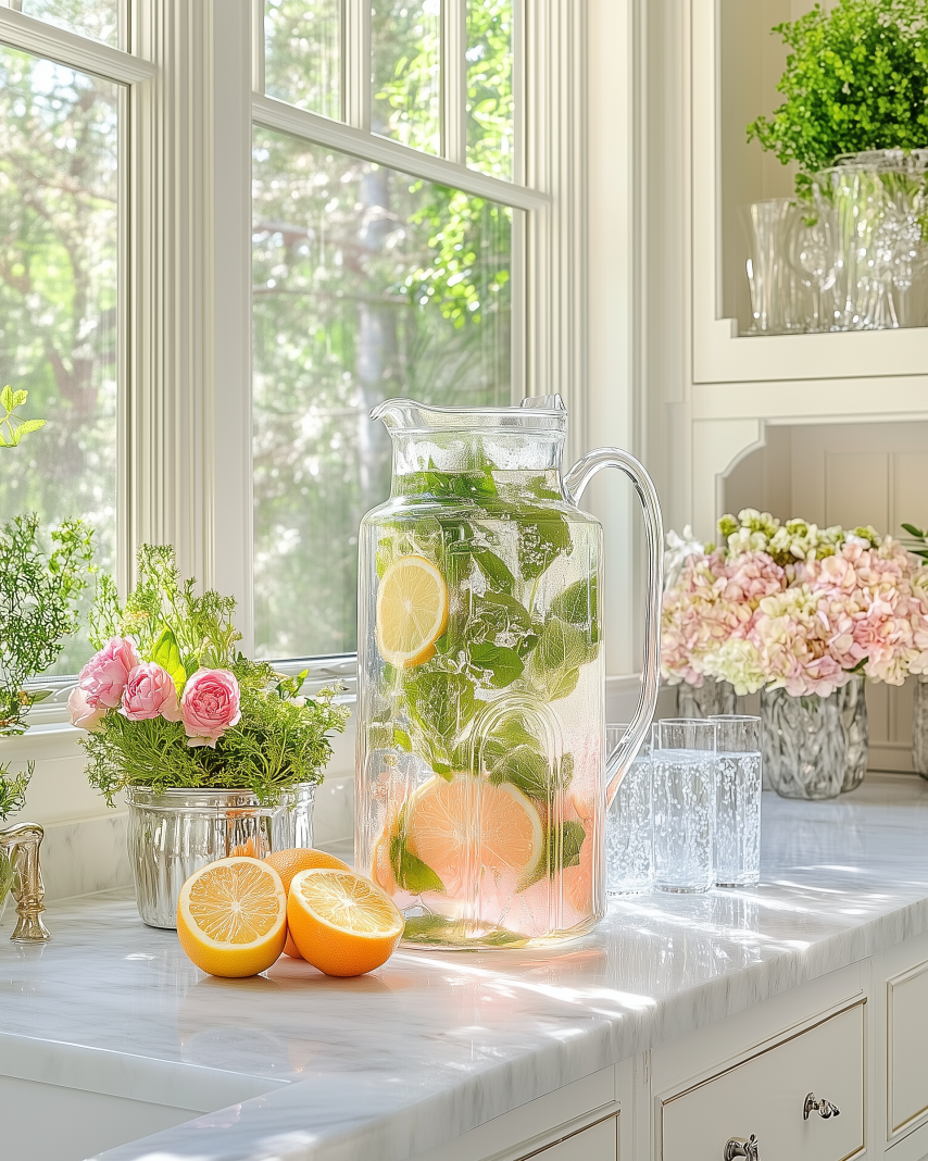 Hydration Corner – Filtered water, sparkling water maker, or infused-water carafe with citrus.
